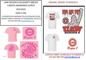 Thank you to Lisa Jacklet from our UAW Local 218 Union Labels standing committee for sharing these resources where Union Members can purchase UAW T-shirts! There are 2 shirts pictured below that you can order directly through UAW Region 8 (pink shirt, and white shirt). These images can also be viewed on our UAW Local 218 Facebook page! https://www.facebook.com/UAWLocal218HurstTexasÂ